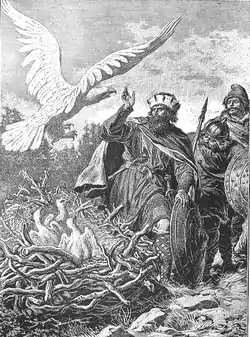 - Лях мандрував на північ, доки не зустрів величного орла, що оберігав своє гніздо. Вражений цією величчю, він вирішив оселитися тут, назвав це місце «Гнезно» (згодом перша столиця Польщі) і прийняв знак білого орла як свій знак, що досі залишається гербом Польщі.