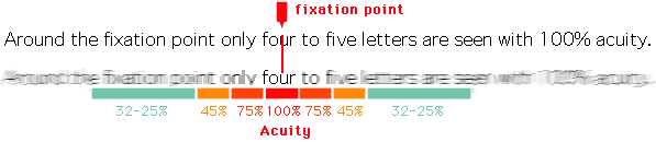 Нижній рядок тексту імітує гостроту зору у відповідних відсотках. Труднощі розпізнавання тексту збільшуються з відстанню від точки фіксації.[5]