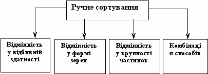 При ручному сортуванні використовують відмінності в кольорі, блиску, формі, структурі мінералів (див. рисунок).