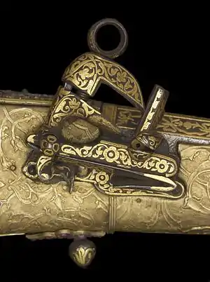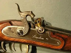 Кременевий замок: курок спущений, полиця відкрита.