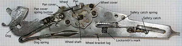 У колісцевому замку кресало зазнало конструктивних змін, перетворившись зі смужки металу в коліщатко з рисками по краю. Це дозволило поліпшити процес утворення іскор, зробити зброю більш надійною і компактною. Спусковий механізм відпускав пружину, яка за допомогою ланцюгової передачі обертала колісце, а воно в свою чергу кресало іскри з кременю і запалювало порох на затравочній полиці. Пізніше з'явилися і замки з колісцем, прихованим всередині механізму, більш елегантні і менш травмонебезпечні (об гострий край колісця легко було порізатися, тому його часто закривали кожухом).