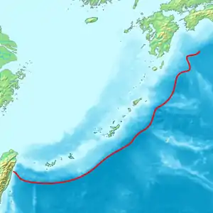 Червоною лінією вказано розташування жолоба Рюкю