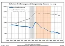 Динаміка населення з 1875 року в сучасних кордонах (Синя лінія: населення; Пунктир: відносна порівняльна динаміка населення землі Бранденбург; Сірий фон: період Третього рейху; Помаранчевий фон: період НДР)
