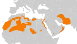 Вид поширений Північній Африці та Південно-Західній Азії від Мавританії на схід через Сахару, Близький Схід та Аравійський півострів до Пакистану. Живе у кам'янистих пустелях та напівпустелях.