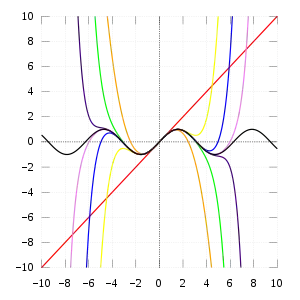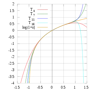 На противагу цьому, також показана картинка функції натурального логарифма і деякі з його многочленів Тейлора навколо . Ці наближення сходяться до функції тільки в області ; за межами цієї області у вищих степенях Тейлора многочлени гірше наближені до функції. Це схоже на феномен Рунге.