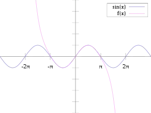 Зображений справа графік є точним наближенням навколо точки . Рожева крива являє собою многочлен сьомої степені: