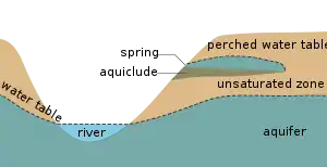 Cross section showing the water table varying with surface topography as well as a perched water table