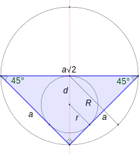 Тут r — радіус вписаного кола, R — радіус описаного кола, a — довжина катетів та c — довжина основи рівнобедреного прямокутного трикутника.