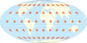 Карта світу в рівновеликій проєкції Мольвейде з нанесеними еліпсами спотворення