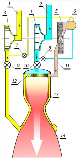 На схемі відпрацьовані гази з турбіни ТНА надходять через форсункову голівку в камеру згоряння разом з компонентами палива (11). Такий двигун називається двигуном із замкнутим циклом (інакше — з закритим циклом), при якому усе витрачене паливо, включаючи використовуване в приводі ТНА, проходить через камеру згоряння РРД. Тиск на виході турбіни в такому двигуні вищий, ніж у камері згоряння РРД, а на вході в газогенератор (6), що живить турбіну, — ще вище. Щоб задовольнити цим вимогам, для приводу турбіни використовуються ті ж компоненти палива (під високим тиском), на яких працює сам РРД (з іншим співвідношенням компонентів, як правило, — з надлишком пального, щоб знизити теплове навантаження на турбіну).
