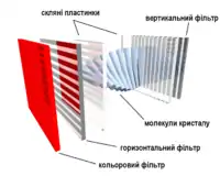 Екран LCD є масивом маленьких сегментів (пікселів), котрими можна маніпулювати для відображення інформації. LCD має кілька шарів, де ключову роль грають дві панелі, зроблені з вільного від натрію і дуже чистого скляного матеріалу, який називають субстратом або підкладкою. Проміжок між шарами заповнений тонким шаром рідкого кристалу. На панелях є борозенки, що надають їм спеціальної орієнтації. Борозенки розташовані паралельно між собою в межах кожної панелі, але борозенки однієї панелі перпендикулярні до борозенок іншої. Поздовжні борозенки утворюються внаслідок нанесення на скляну поверхню тонких плівок прозорого пластику, що потім спеціальним чином обробляється.