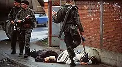 ![]() Бойовик «Сербської добровольчої гвардії» б'є ногою конаючу боснійку. Зображення американського фотожурналіста Рона Хавіва | |