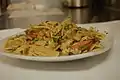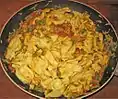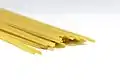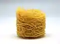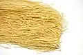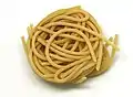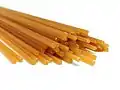 Спагеті (італ. Spaghetti) | Довга, тонка, циліндрична паста італійського походження, зроблена з семоліни або борошна і води.[35] Spaghettini та spaghettoni трохи тонші або товщі відповідно.[36] | "Маленькі струни". Spaghetti множина італійського слова spaghetto, що є зменшенням spago, що означає "тонка струна" або "шпагат". | Fide/fidi, fidelini, ristoranti, vermicelloni, filatelli, vermicelloni giganti | |