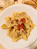 Cavatelli | Короткі, суцільної довжини. Існують у трьох розмірах, зазвичай вимірюються в пальцях (один, два, три)[56] | Від слова cavare, "дупло". | Cortecce,[57] gnocchetti, manatelli, orecchie di prete, strascinati, truoccoli ; capunti, cingule, minuich, rascatelli, zinnezinne (Базиліката); cantaroggini, cavatieddi, cecatelli/cicatelli, cecatidde, mignuicchi, strascenate, tagghjunghele (Апулія and Кампанія (Італія)a); pincinelle (Марке); cavatielle, 'ncatenate, cazzarille, ciufele (Molise); cavasuneddi, cavatuneddi, gnucchitti, gnocculi (Сицилія), pizzicarieddi (Апулія)[58]. Pictured is dry capunti, a variety of cavatelli from Apulia. | Південна континентальна Італія (i.e. Кампанія (Італія), Апулія, Молізе, Базиліката, Калабрія) та Сицилія |