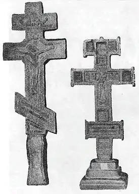 Різьбленні хрести на Лемківщині діляться на чотири типологічних групи — ручні, напрестольні, прецесійні і придорожні. Найдавніший ручний семиконечний хрест Василя Поповича походить із села Мошанець, датований 1689 роком. Прецесійні хрести здебільшого були з мальованими зображеннями, як, наприклад, профільований мальований хрести 1680 р. з церкви с. Воловець. Лише в XIX ст.. з'являються хрести з переважаючим різьбленим декором і поліхромуванням (процесійний хрест зі с. Репецьк, XIX ст.).