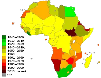 | Демократична Республіка Конго | 30 VI 1960 | Бельгія | • з 1885 — Вільна держава Конго • 1908 — колонія Бельгійське Конго 1971 — зміна назви на Заїр • від 17 VI 1997 повернена колишня назва |