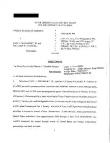 27 жовтня 2017 року Велике федеральне журі пред'явило Гейтсу і Манафорту звинувачення в рамках Спеціального прокурорського розслідування під керівництвом Роберта Мюллера щодо російського втручання в американські вибори 2016 і пов'язані з цим питання.[8][9] Цих двох чоловіків звинувачено за дванадцятьма пунктами в змові проти Сполучених Штатів, неправдивих свідченнях, відмиванні грошей в розмірі «десятків мільйонів доларів», і відсутності реєстрації як іноземних агентів в Україні, як того вимагає Закон про реєстрацію іноземних агентів.[10] Звинувачення стосуються лише їхньої роботи консультантами на користь проросійського уряду в Україні і не мають жодного стосунку до передвиборчої кампанії Трампа.[11]