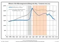 Динаміка населення з 1875 року в сучасних кордонах (Синя лінія: населення; Пунктир: відносна порівняльна динаміка населення землі Бранденбург; Сірий фон: період Третього рейху; Помаранчевий фон: період НДР)