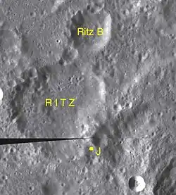 ![]() Світлина із зонда Lunar Reconnaissance Orbiter. Кратер Рітц у центрі світлини. У нижньому правому куті видно частину кратера Склодовська | |