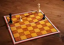 Це один з найвідоміших шахових етюдів. На перший погляд, завдання неможливо виконати: наздогнати чорного пішака білому королю не вдається (1. Крh7 h4 2. Крh6 h3 і т. д.), навпаки — чорний король може легко затримати білого пішака, коли той просунеться вперед.