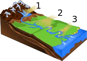Верхня течія утворюється неподалік витоків річки (рівнинні річки беруть початок, зазвичай, з джерела, болота чи озера, а гірські — з льодовика).