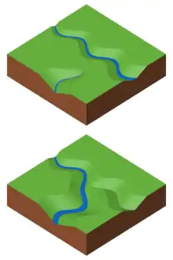 - крутий вигин або поворот річки не зумовлений геологічною причиною; спостерігається на рівнинах,