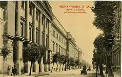 Споруду вибудовано на узвишші і її головний фасад, який простягся більш ніж на 140 метрів, повернутий до міста. Будівля споруджена в 1827 році як хлібні склади (хлібний «магазин», лабаз) одеським хлібним магнатом графом Ієронімом Собанським. Незважаючи на нежитлове призначення, будувались з архітектурною вишуканістю. Це була звична практика доби класицизму, що не виробив окремих типів споруд для навчальних закладів, бірж, пошти, лікарні тощо. Майстри класицизму використовували типовий проект палацу, кожен раз пристосовуючи його то під навчальний заклад, то під біржу, то під військовий шпиталь чи міську лікарню. Не виняток і зернові склади графа Собанського, вибудовані єдиним видовженим блоком та декорованими за типовим проектом палацу доби класицизму. Подібна практика сприяла дискредитації пізнього класицизму і він дійшов до власної кризи.
