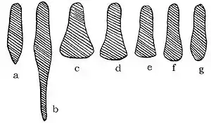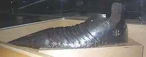 Еволюція форми сабатонів: а) 1290—1390. b) 1300—1490. с) 1500—1530. d) 1530—1540. е) 1540—1550. f) 1550—1560. g) 1560—1590