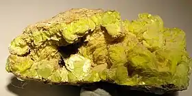 Містить(%): Al2О3 — 2,65; UO3 — 65,22; P2O5 — 16, 08; H2O — 15,98.
