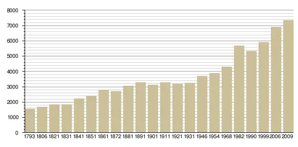 Динаміка населення (pour le recensement de 1836, archives départementales de la Loire-Atlantique[3], base Cassini de l'EHESS pour les nombres retenus jusque 1962[4], base Insee à partir de 1968 (population sans doubles comptes puis population municipale à partir de 2006)[5] · [6] · [7]. ):