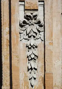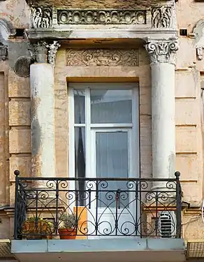 Бічні балкони на другому поверсі фланковано тричвертевими колонами з антаблементом.
