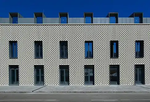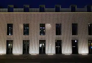 Перший корпус, який збудували у липні 2020 року, вирішений у формах концептуальної сучасної архітектури. Будівля цегляна. Фасад двошаровий. Ефект прозорості досягли завдяки перфорованій цегляній кладці, змурованій перед скляною конструкцією. У вечірній час будівля підсвічується, в наслідок чого її вигляд змінюється[21].