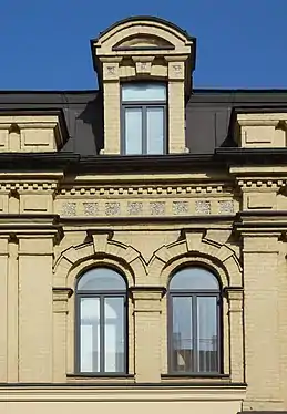 Фільонки вставлені під вікнами і на фризі. Карниз прикрашено дентикулами (сухариками). Фасад увінчують три аттики з лучковим фронтоном і даховим вікном (люкарною).