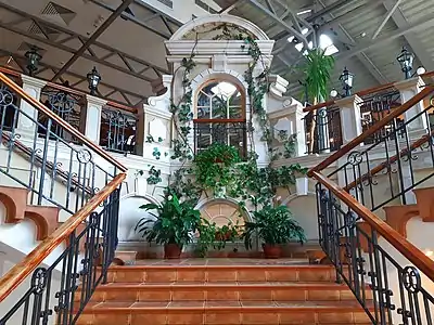 Будівля має три портали — декоративні бокові й наріжний з бетонним піддашшям[1].