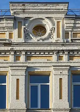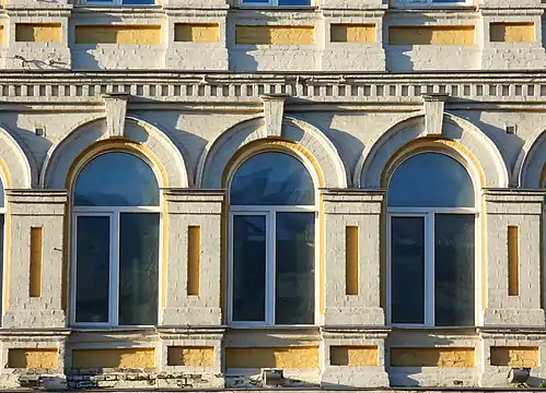 Площини підкреслені чітким ритмом віконних прорізів. Вікна на другом поверсі — аркові із замковими каменями, на першому і третьому — прямокутні.