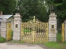 П. В. Оржевський у 1880-х роках збудував огорожу і браму з прибрамним будинком. Справжньою окрасою парканного комплексу стали центральні в'їзні ворота. Зведена в мотивах неоготики, брама являє собою металеву конструкцію з кованого заліза. Ця трипролітна масивна споруда покоїться на чотирьох строгих пілонах, які обрамлені гранітними стовпами, виконаними майстрами із сірого граніту, завезеного з-під Шепетівки. Пілони вінчаються кованими ліхтарями.
