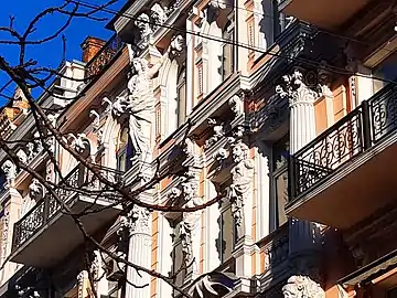 Фасад оздоблений різноманітним декором і скульптурами. Дві каріатиди містяться на четвертому поверсі, дві герми — на третьому, маскарони — на фризі й базах колон, а також ліпний рослинний орнамент по всій площині.
