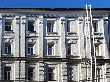 Головний чотириповерховий будинок зведено у 1899—1900 роках на червоній лінії забудови вулиці. Чоловий фасад оформлений у стилі неоренесанс із надзвичайною пишністю.
