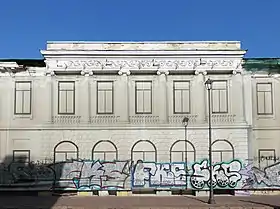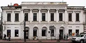 Центральна вісь виділена ризалітом-портиком іонічного ордера. Високий цоколь оздоблено рустом. На ньому — колони з антаблементом. На першому поверсі — аркада з віконними прорізами, які прикрашені замковими каменями. Прямокутні вікна другого поверху оздоблені сандриками на кронштейнах, простими лиштвами та балюстрадою.