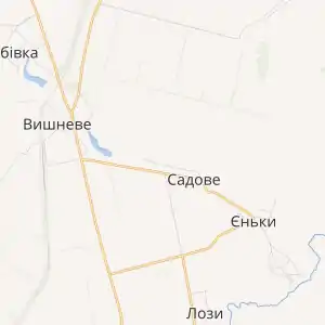 Село Садове знаходиться між селами Вишневе та Єньки. По селу протікає пересихаючий струмок з загатою. Поруч проходить автомобільна дорога Т 1716.