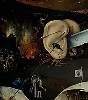 Дивна істота з пташиною головою та великим напівпрозорим міхуром поглинає грішників, а потім скидає їх тіла в ідеально-круглу вигрібну яму. Туди ж скупар засуджений вічно випорожнюватися золотими монетами, а інший, судячи з усього, ненажера — неспинно вивергати з'їдені ласощі. Мотив демона або диявола, який сидить на високому стільці, запозичений з тексту «Видіння Тундала». Біля підніжжя престолу сатани, поруч з пекельним полум'ям, оголену жінку з жабою на грудях обіймає чорний демон з ослячими вухами. Обличчя жінки відбивається у дзеркалі, прикріпленому до сідниць іншого, зеленого демона, — така відплата тим, хто піддався гріхові гордині.