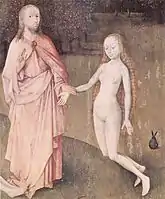 На передньому плані цього ландшафту, що показує допотопний світ, зображена не сцена спокуси або вигнання Адама і Єви з Раю (як у «Возі сіна»), а їх з'єднання Богом. Взявши Єву за руку, Бог підводить її до Адама, який щойно прокинувся, і здається, що той дивиться на це створіння зі змішаним почуттям подиву та передчуття. Сам Бог набагато молодший, ніж на інших картинах, він постає в образі Христа, другої особи Трійці та втіленого Слова Бога.