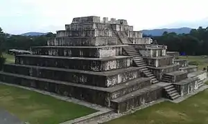 З півночі вхід до міста здійснювався через вузький земляний міст, що дозволяв вправно захищати місто від ворожого нападу. Церемоніальний центр має площу 1400 м2, складається з 43 будов. Храми включають у себе талуд таблеро з подвійними сходами. Фасади деяких будівель мають циліндричні колони. Основу центр разом з головною площею (площа 1, 54х38 м) становить велика піраміда, основа якої створено з вулканічного попелу. Широкі сходи ведуть до царського поховання, де знайдено 100 керамічних посудин та 34 піритових дзеркал.