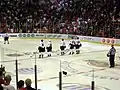 Гравці «Анагайм Дакс» у матчі проти «Детройт Ред Вінгз»: Йонас Гіллер (№1), Теему Селянне (№8), Джейсон Блейк (№33), Саку Койву (№11), Пол Мара (№23), Кем Фаулер (№54).