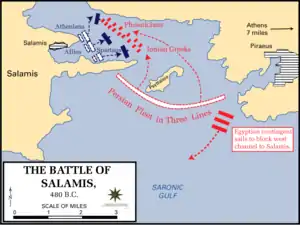У Саламінській протоці, яка відділяє острів від материкової Греції у 480 до н. е. відбулася вирішальна битва між грецьким та перським флотами, що завершилася перемогою греків.
