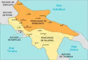 У 841 князь Беневентський Сікард помер. Його воєначальник Радельхіз проголосив себе князем, усунувши від престолу брата покійного і його спадкоємця Сіконульфа, якого ув'язнив у Таранто. Мешканці Амальфі звільнили Сіконульфа з тюрми та проголосили його князем у Салерно. Розпочалася громадянська війна. У 847 імператор Священної Римської імперії Лотар I доручив герцогу Сполетському Гі I і неаполітанському дуці Сергію I вести перемовини про поділ великого лангобардського князівства. У 849 король Італії Людовик II Radelgisi et Siginulfi principum Divisio Ducatus Beneventani поділив князівство на два зі столицями у Беневенто і Салерно.