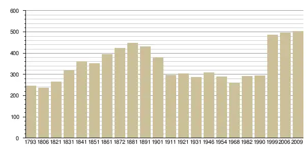 Динаміка населення (base Cassini de l'EHESS pour les nombres retenus jusque 1962[3], base Insee à partir de 1968 (population sans doubles comptes puis population municipale à partir de 2006)[4] · [5] ):