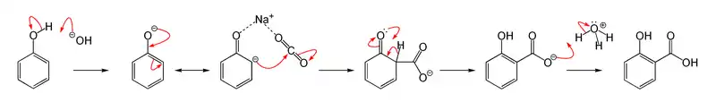 Слід звернути увагу, що таке карбоксилювання фенолу, по-перше оборотне і, по-друге, істотну роль у карбоксилюванні в орто-положення до фенольному гідроксилу грає ефект взаємодії координаційної зв'язку катіона лужного металу з кисневими лігандами з утворенням хелатообразного проміжного стану: так, в орто-положення з утворенням саліцилату карбоксилювання відбувається тільки у випадку фенолятів натрію і літію, у разі фенолятів калію, рубідію і цезію карбоксилювання йде по пара-положенню — катіони цих лужних металів мають більший радіус і координаційна стабілізація перехідного стану неможлива. Про оборотності реакції говорить також перегрупування дікалієвої солі саліцилової кислоти в дікаліевую сіль пара-гідроксібензойной кислоти і перетворення натрієвої солі пара-гідроксібензойной кислоти при нагріванні в динатрієву сіль саліцилової кислоти.