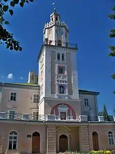 Приміщення першого поверху перекрите хрестовими, циліндричними та парусно-зімкненими склепіннями. Висотним елементом будівлі є триярусна, квадратна в плані вежа з південного боку. Її верхній восьмигранний ярус із годинниками завершений восьмигранним ліхтарем.