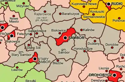 - Самбірський — з міської ґміни Самбір та сільських ґмін Баранівці, Бісковичі, Блажів і Самбір;